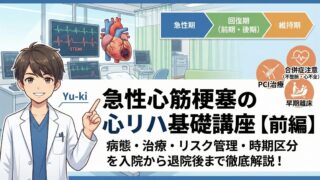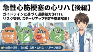 【後編】急性心筋梗塞のリハビリ実践ガイド。運動処方の基本「FITT」の決定方法、CPXがない場合の負荷設定、そして絶対に知っておくべき「ステージアップ判定基準」と中止基準について、臨床ですぐ使えるアルゴリズムを解説します。