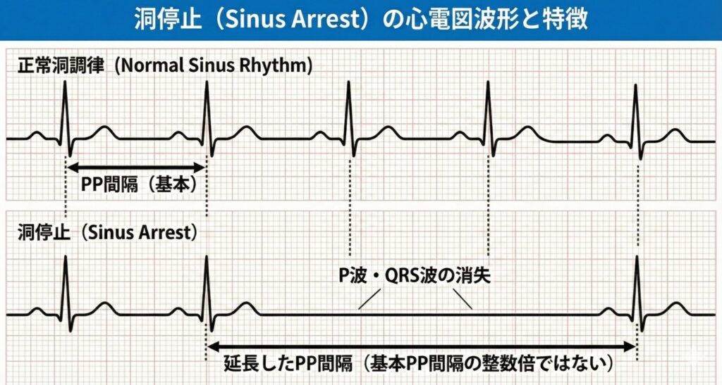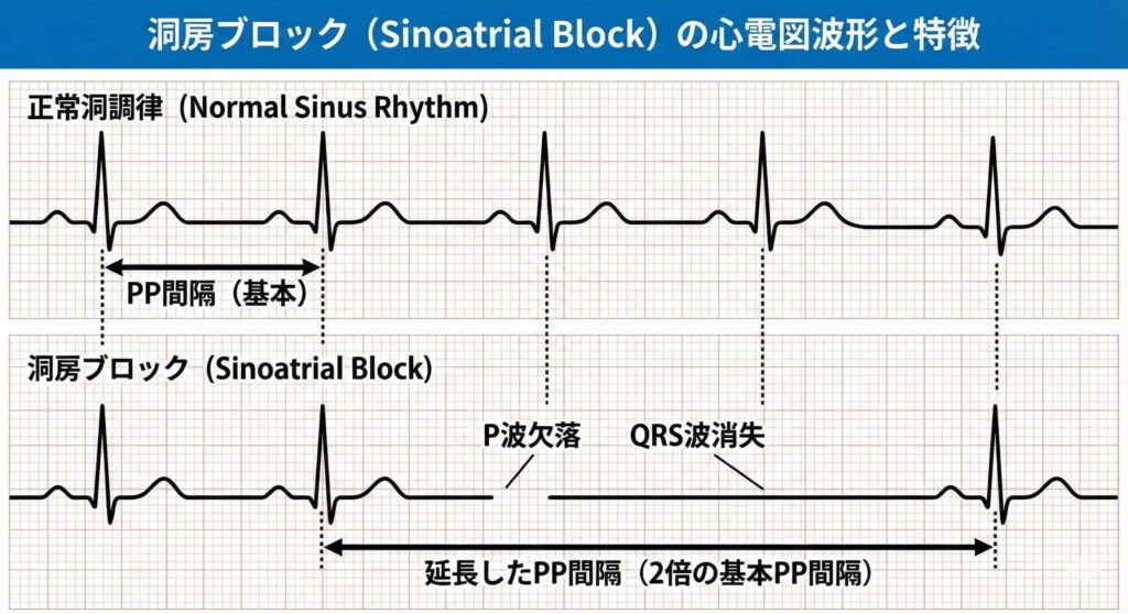 洞房ブロック: P波が消えた間隔が、基本周期(PP間隔)の整数倍になる。