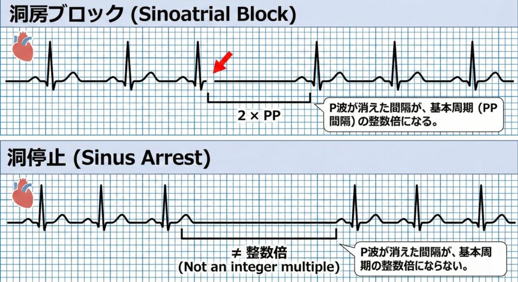 - 洞房ブロック: P波が消えた間隔が、基本周期(PP間隔)の整数倍になる。