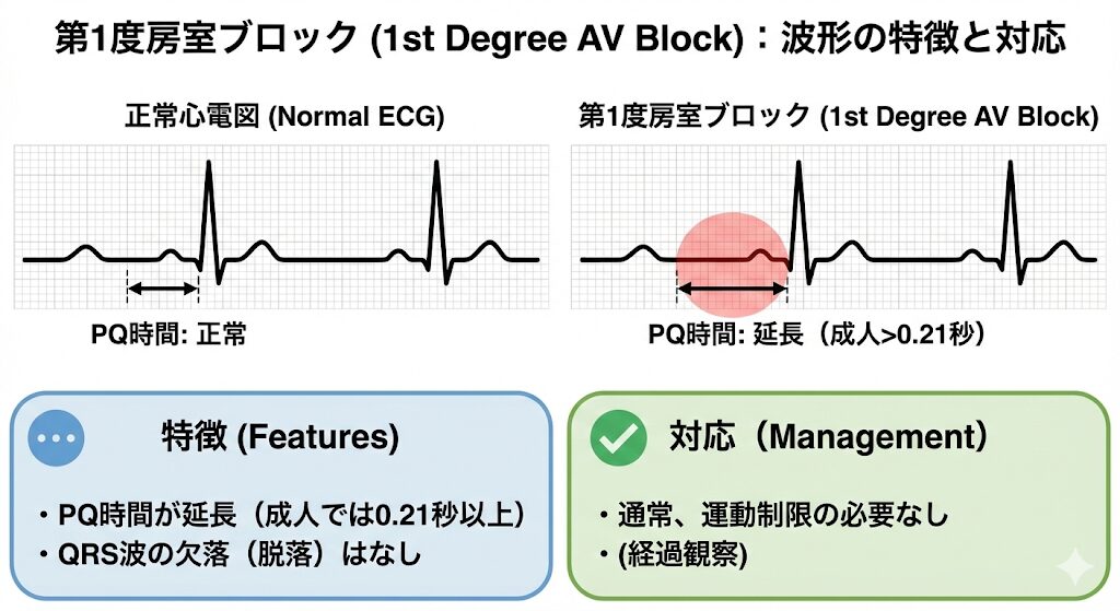 - 特徴: PQ時間が延長する(成人では0.21秒以上)。QRS波の欠落(脱落)はありません。