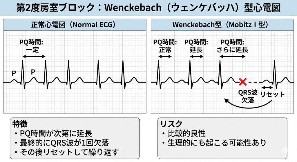 - Wenckebach型 = 「だんだん伸びてポン」= 比較的安全