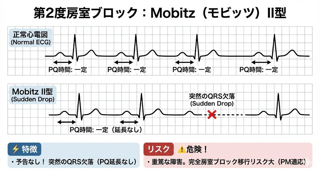 - Mobitz II型 = 「突然ポン」= 危険(PM適応あり)