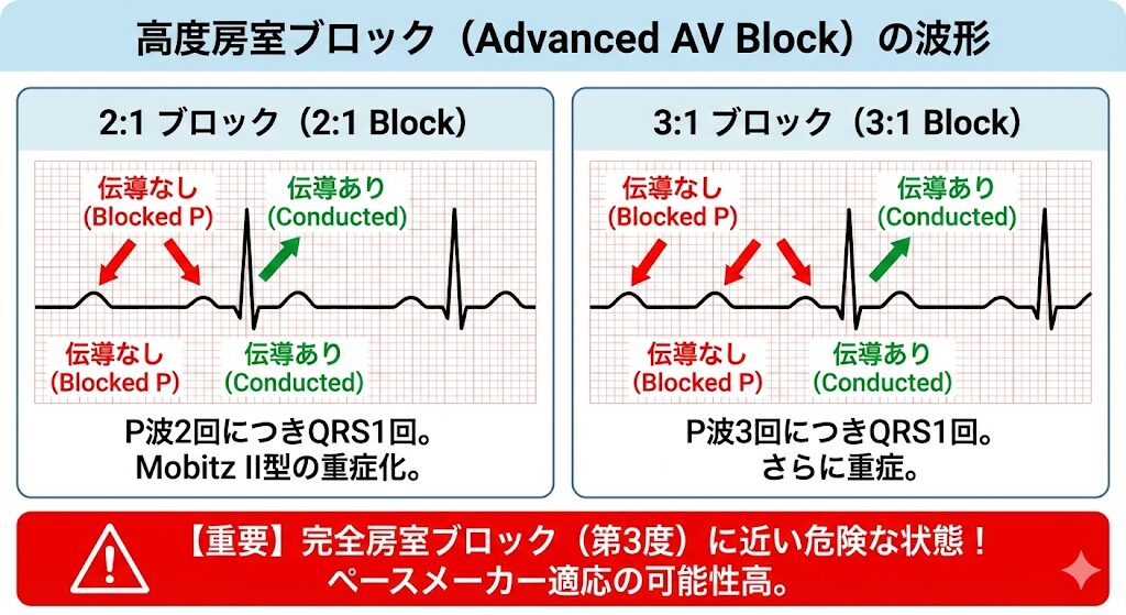 第2度房室ブロックのうち、2個以上のP波に対して1つのQRS波しか伝導しない(比率が 2:1、3:1 など) 場合を指します。