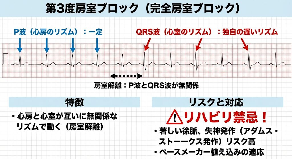 - リスク:リハビリ禁忌!徐脈が著しく、アダムス・ストークス発作(失神)のリスクが高いため、ペースメーカー植え込みの適応となります