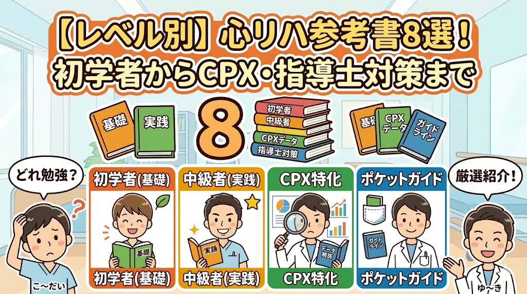 心臓リハビリテーションの分野は、解剖生理、心電図、薬理学、運動処方など、学ぶべき範囲が非常に広範です。そのため、「今の自分のレベル」と「何を知りたいか(病態なのか、リスク管理なのか、CPXなのか)」に合わせて参考書を選ぶことが、最速でスキルアップするコツです。