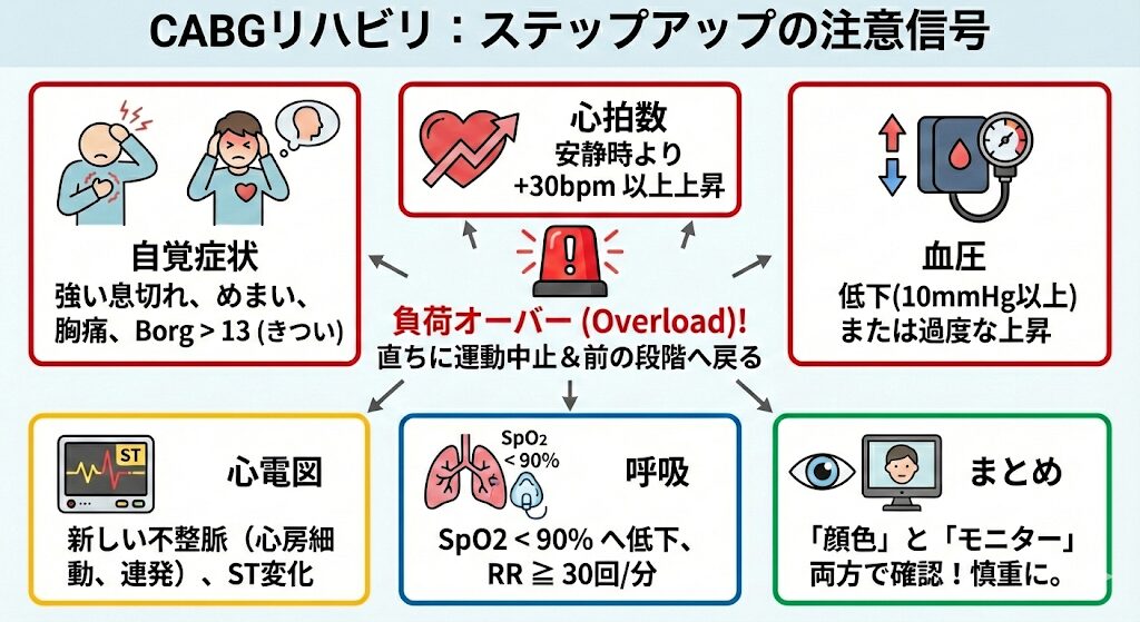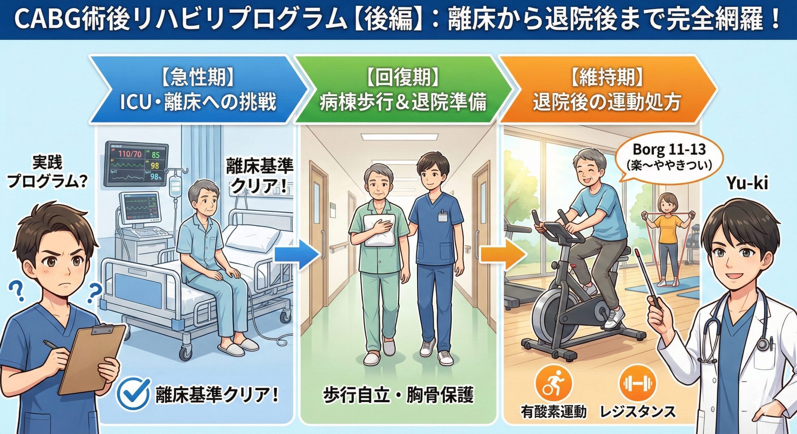術後は「状態(バイタル)」を見ながら、段階的に進めていくのが鉄則だよ。 今回は、CABG術後の「離床基準」から「退院後の運動メニュー」まで、具体的なプログラムを解説するね!