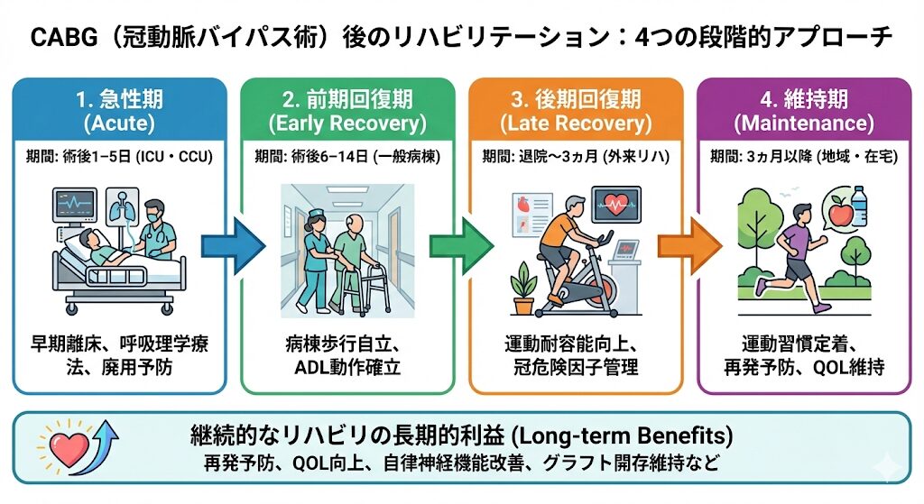 | 急性期 | 術後1–5日 (ICU・CCU) | 早期離床、呼吸理学療法 廃用症候群の予防 |