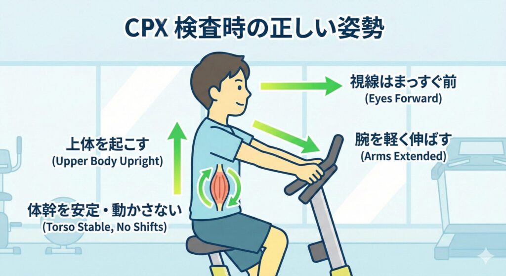 CPXは「ただ漕いでもらう」だけの検査ではありません。「サドルの高さ」「室温」「マスクのフィット感」、これら全ての準備が整って初めて、信頼できるデータ(ATやPeak VO2)が得られます。