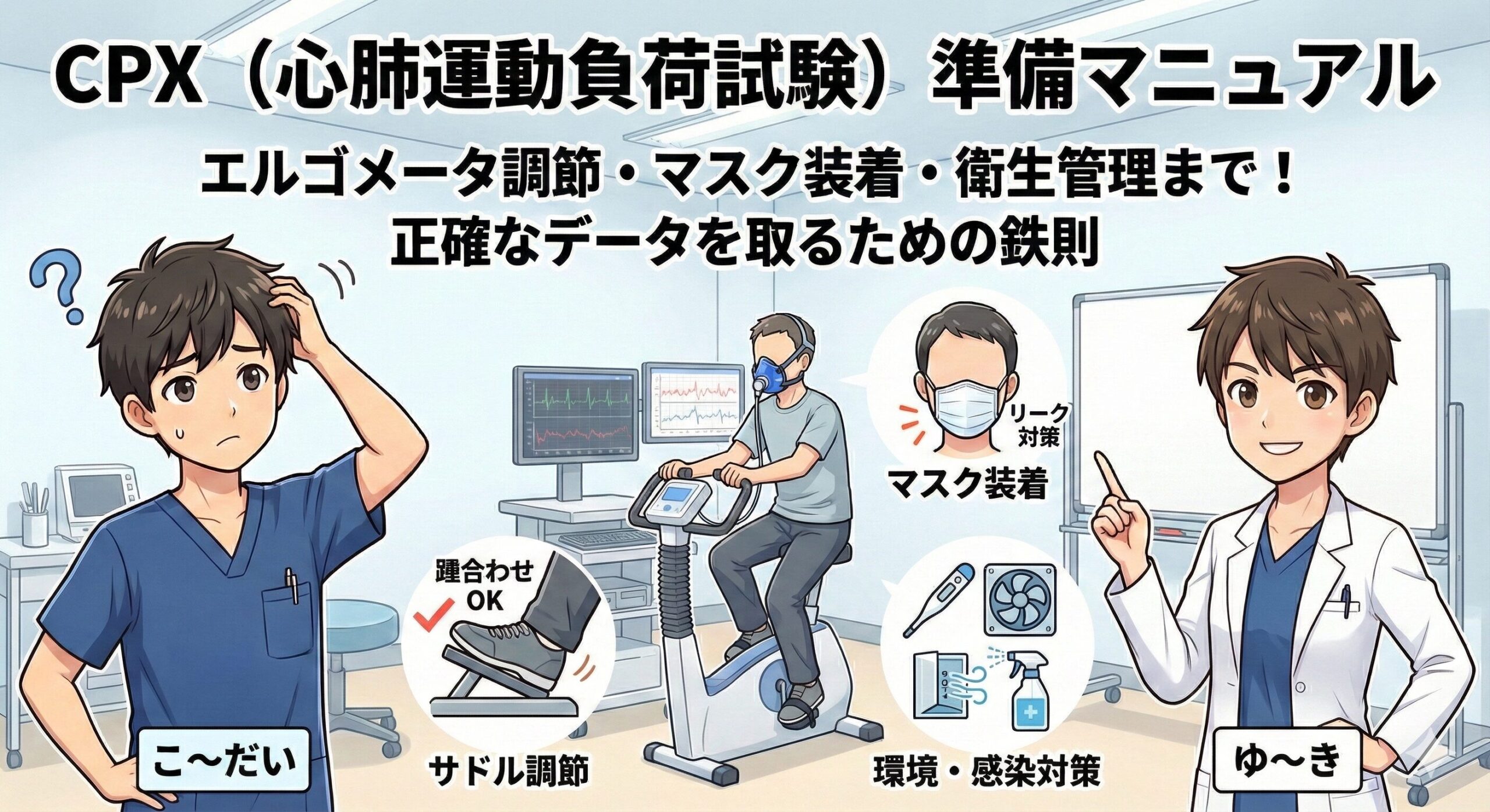 今回は、CPXで使用するエルゴメータの調節と管理面から衛生管理と感染症対策まで網羅的に解説しました。