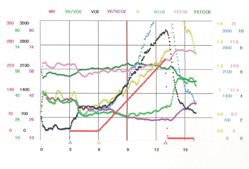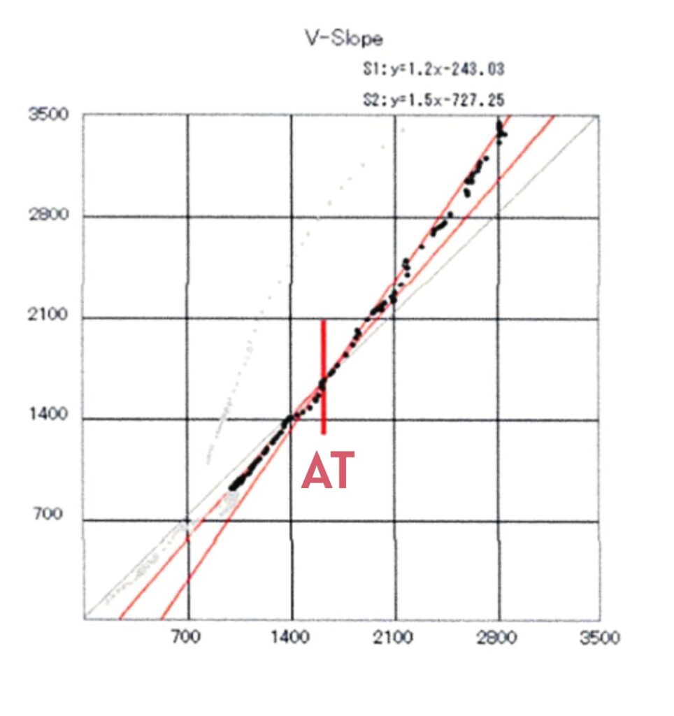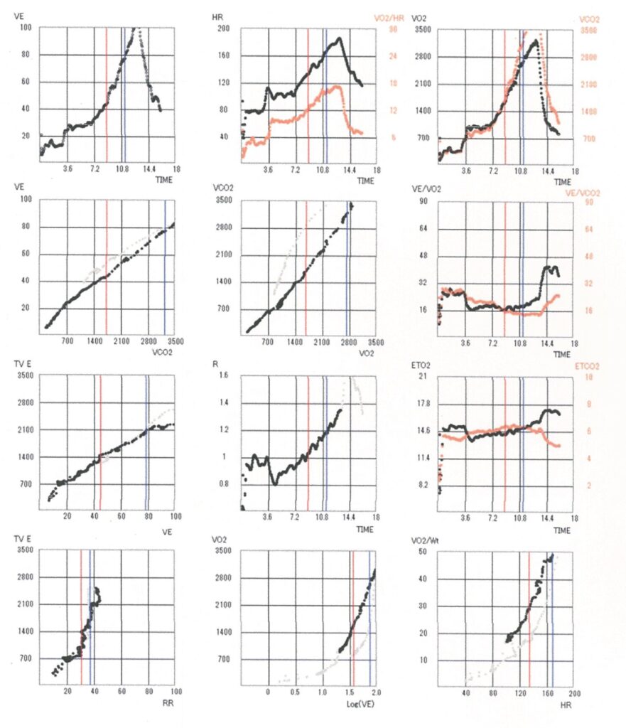 トレッドミルや自転車エルゴメーターなどの運動負荷装置を利用して運動負荷試験を行い、最高酸素摂取量、嫌気性代謝閾値(AT)などの呼吸・循環・代謝指標を測定することです。