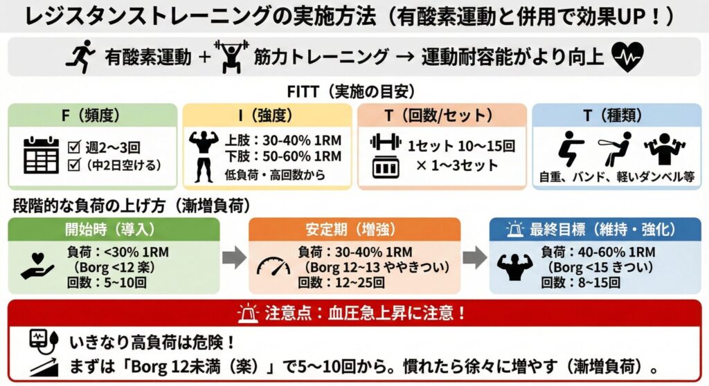 ⚠️ 注意点:いきなり重い負荷をかけると血圧が急上昇し危険です。まずは「Borg 12未満(楽に感じる)」負荷で5~10回から始め、慣れてきたら徐々に回数や負荷を増やしていきましょう(漸増負荷)。