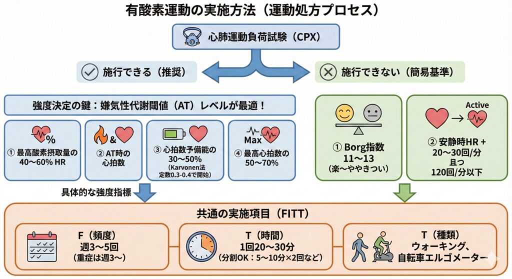 運動処方を行う場合、可能であれば心肺運動負荷試験(CPX)を施行して嫌気性代謝閾値(AT)を用いて運動プログラムを作成した方が望ましいです。