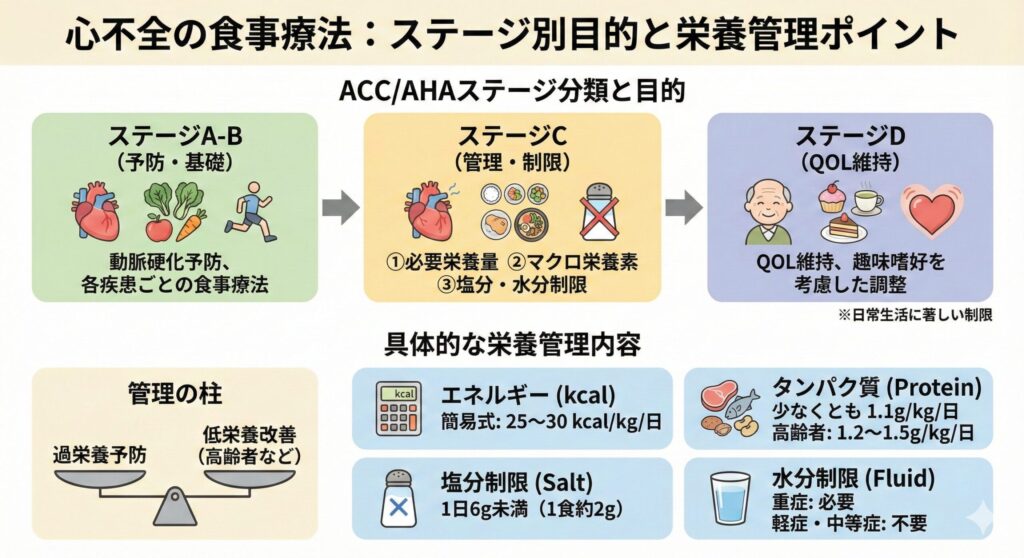 心不全診療ガイドラインによると、食事療法について心不全のステージごとにA~Dに分類することが示されています。