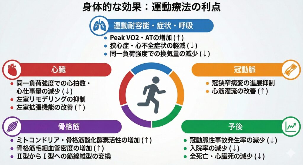 運動療法は心リハの中核となる役割をもっており、以下に示すさまざまな身体的な効果をもたらすと言われています。
