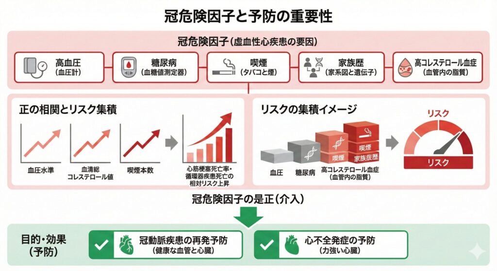 また、血圧水準、血清総コレステロール値、喫煙本数は心筋梗塞の死亡率と正の相関を示すこと、それらリスクの集積により循環器疾患死亡の相対リスクがさらに高まることが示されています。そのため冠危険因子を是正することで冠動脈疾患の再発予防および心不全発症の予防をすることが目的となります。