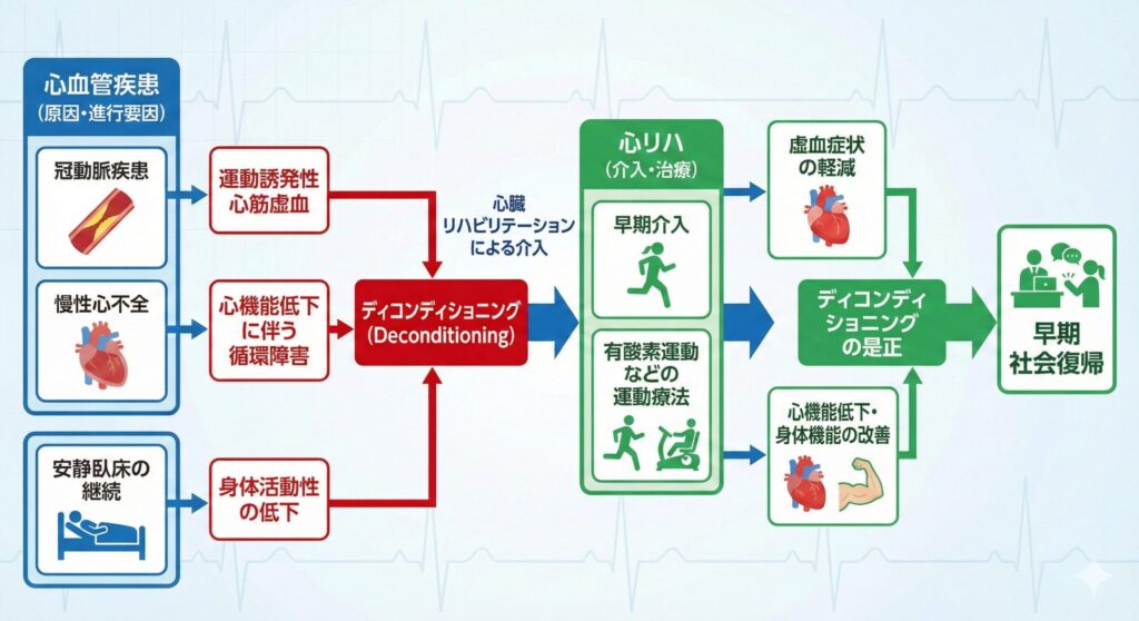 心血管疾患を有する患者において、冠動脈疾患では運動誘発性心筋虚血、慢性心不全では心機能低下に伴う循環障害によりディコンディショニングが生じることが知られています。加えて安静臥床が続くことで身体活動性の低下がみられ、よりディコンディショニングが進行することも報告されています。