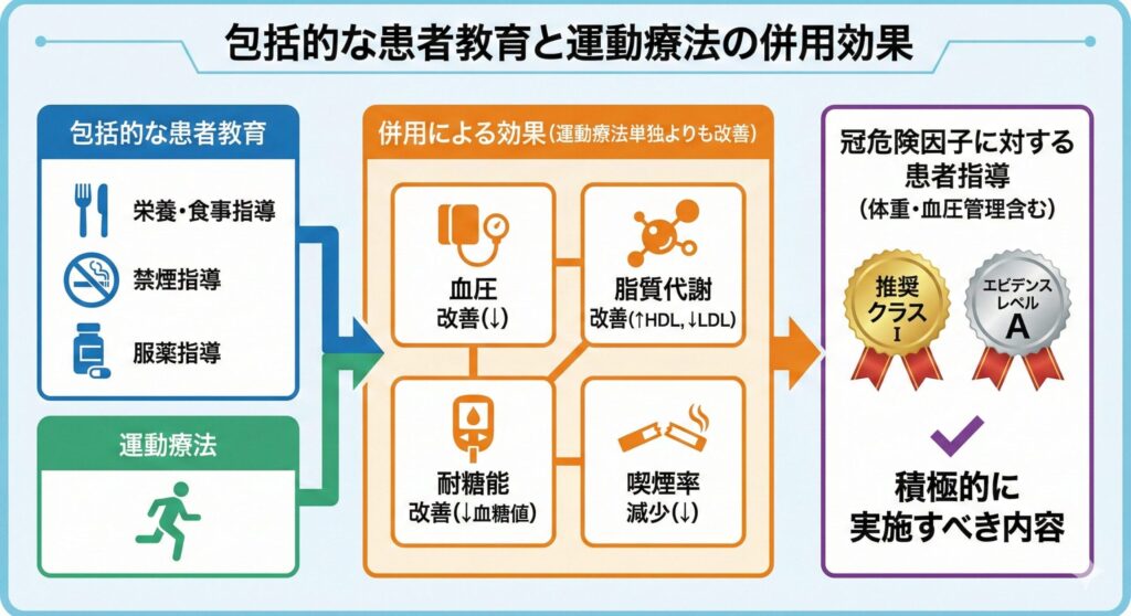 ここでいう患者教育とは、栄養・食事指導、禁煙指導、服薬指導などを含めた包括的な意味合いを持ちます。こうした患者教育と運動療法を併用することで、運動療法単独よりも、血圧、脂質代謝、耐糖能の改善、喫煙率の減少などをもたらすといわれています。