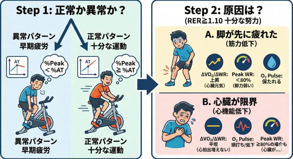 - 正常パターン: %Peak ≧ %AT (ATを超えてもしっかり運動できた)