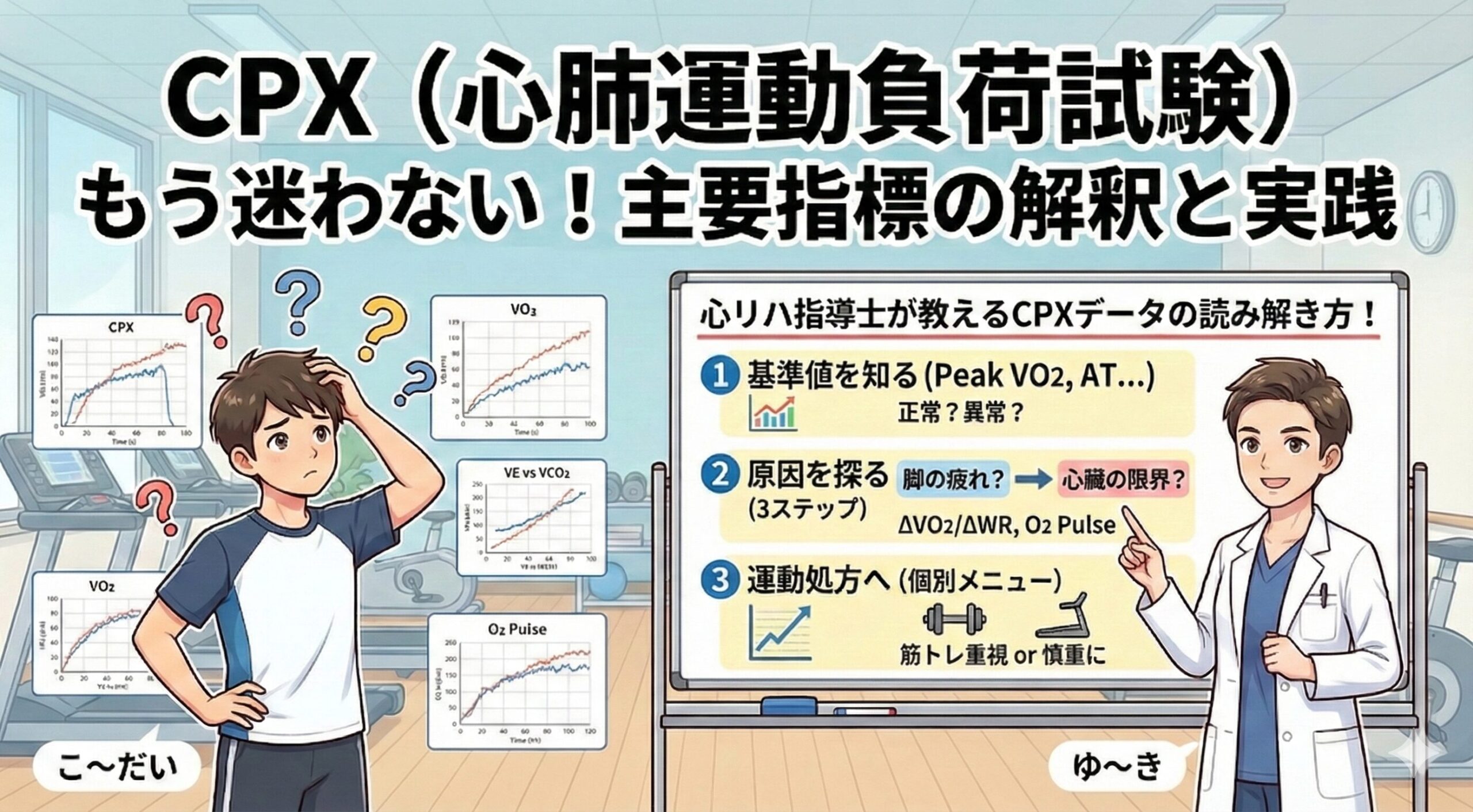 心臓リハビリテーションで行う心肺運動負荷試験(CPX / CPET)は、運動耐容能を定量化し、予後を予測するための強力なツールです。しかし、レポートには多くの数値が並び、「結局、この患者さんは何が悪いの?」と迷うことも少なくありません。