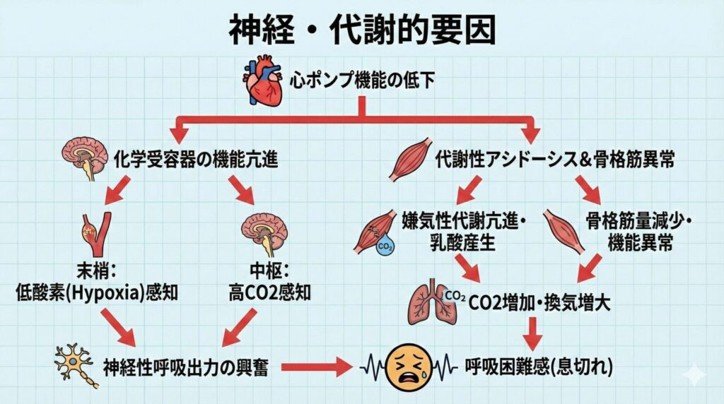 末梢化学受容器(頸動脈小体など)は低酸素(Hypoxia)を感知し、中枢化学受容器は二酸化炭素(CO2)の変化(高炭酸ガス血症)を感知します。これらの刺激は、神経性の呼吸出力を興奮させ、換気量を増やし、呼吸困難の強度を増大させます。