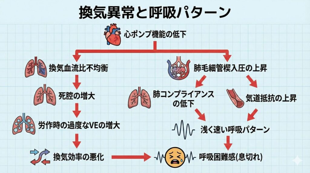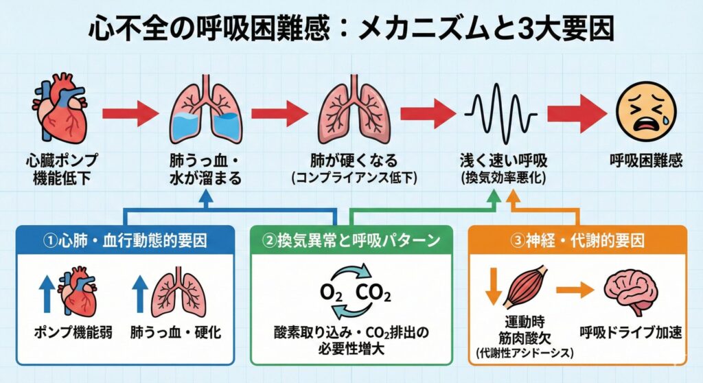 心臓のポンプ機能が弱いために肺に水が溜まり(うっ血)、肺が硬くなる(コンプライアンス低下)。その結果、必要な酸素を取り込み、CO2を排出するために、浅く速い呼吸(換気効率の悪い呼吸パターン)を強いられることが、息苦しさの主な感覚を引き起こします。さらに、運動時に筋肉が酸欠になりやすく(代謝性アシドーシス)、これも呼吸ドライブを加速させます。