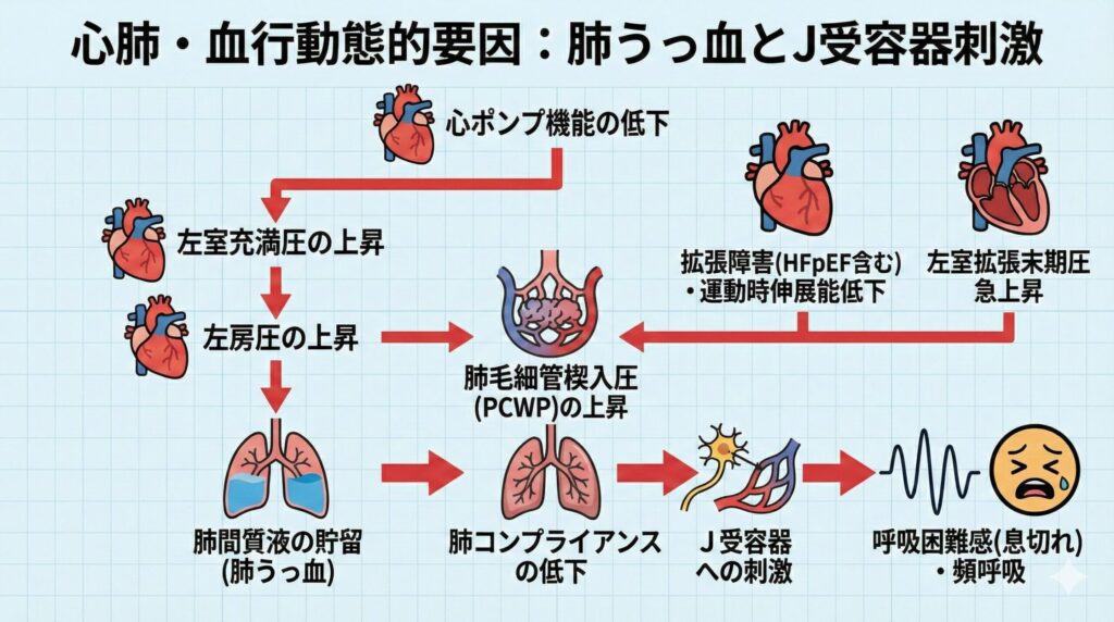 特に、左室充満圧が増加し、その結果として肺毛細管楔入圧(PCWP)が上昇すると、肺間質液が貯留します。これにより肺コンプライアンスが低下し、求心性の迷走神経末端に位置する傍毛細管受容器(J受容器、J-receptors)が刺激されます。この刺激は頻呼吸や息切れを誘発すると考えられています。J受容器は心不全によって興奮し、神経性の呼吸出力を高め、呼吸困難感の強度を増大させるといわれています。