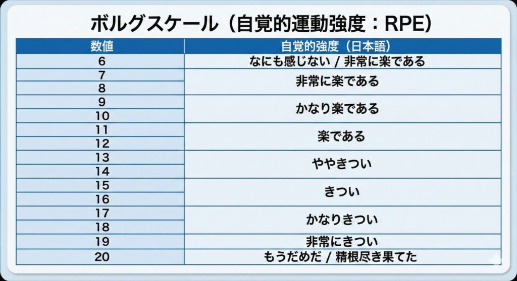 自覚的運動強度(Borg scale)を指標とする: 「息切れ」や「足の疲労感」がどのくらいかを11~20の数値で評価します。目安は「11(楽)~13(ややきつい)」の範囲です。