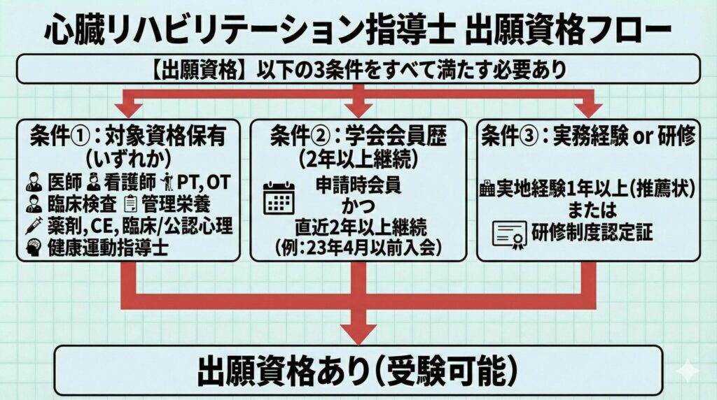 心リハ指導士を取得するためには、以下の4つの条件をすべて満たす必要があります。