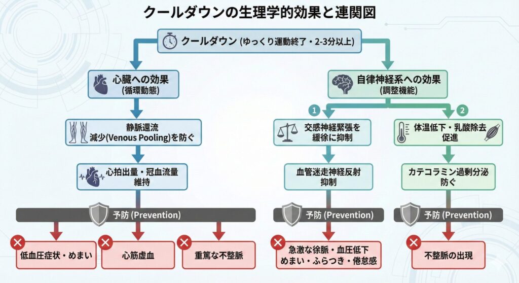 急激な運動終了による静脈還流量の減少(Venous Pooling)を防ぐことで、心拍出量・冠血流量の維持を図ります。これにより、低血圧症状やめまい、心筋虚血による重篤な不整脈を防ぎます。