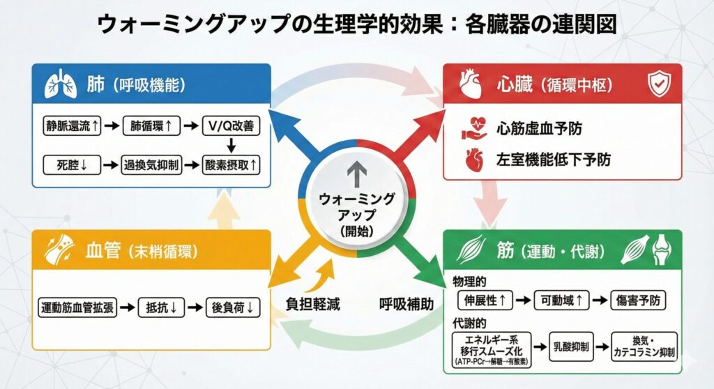 ウォーミングアップの効果は各臓器で見られます。ここでは肺、心臓、血管、筋に分けて解説します。