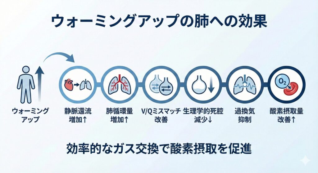 静脈還流量の増加により肺循環量が増加することで、換気血流比不均等(V/Qミスマッチ)が改善されます。これにより生理学的死腔が減少して、運動早期の過換気が抑制されることで酸素摂取量が改善されます。