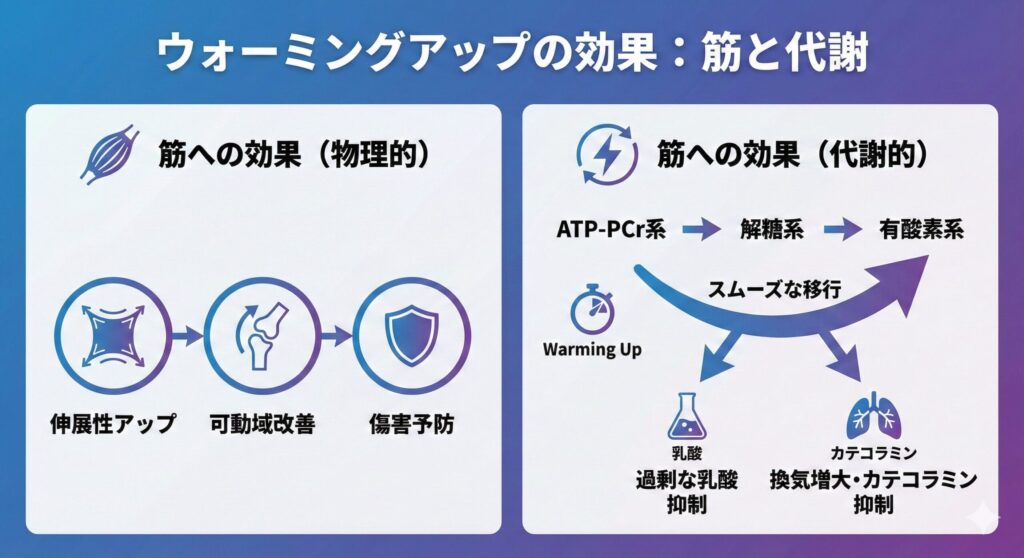 また代謝面では、運動直後のエネルギー産生は筋内のATP分解と「ATP-PCr系」から始まり、「解糖系」を経て「有酸素系」へと移行します。ウォーミングアップはこの移行をスムーズに行うことができます。これにより、解糖系で生じるであろう過剰な乳酸の産生を抑制し、換気増大やカテコラミンの過剰分泌を抑えることができます。